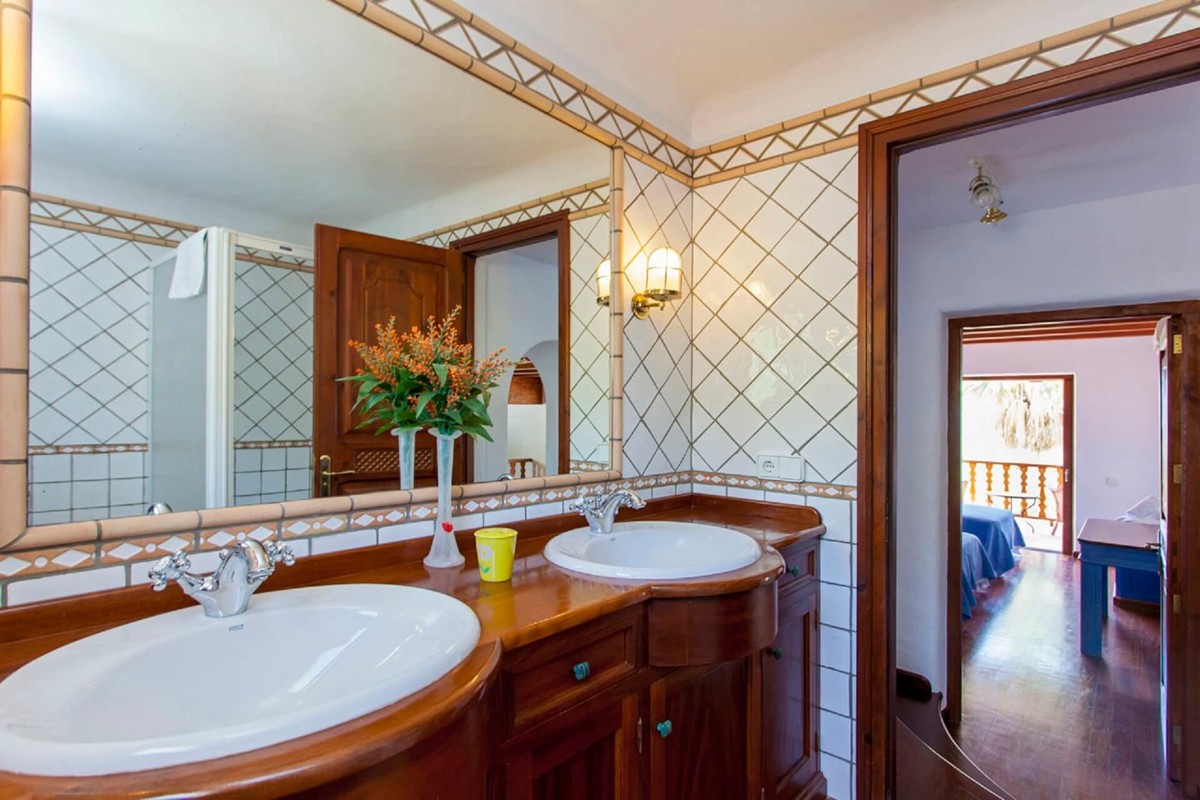 The swimming pool is located in the middle of the perfectly landscaped Mediterranean garden with a pond and its own Rio. A special highlight is the 50 m² detached BBQ house in the garden. In addition to the barbecue area, you will also find a stove, a fridge and freezer, a sink and a bar. There is also a separate toilet with washbasin. The covered terrace with table and chairs for up to eight people allows you to enjoy a cozy lunch or dinner outdoors at any time. Torres Carón offers the conditions for relaxing living on a plot that cannot be seen and therefore offers complete privacy.