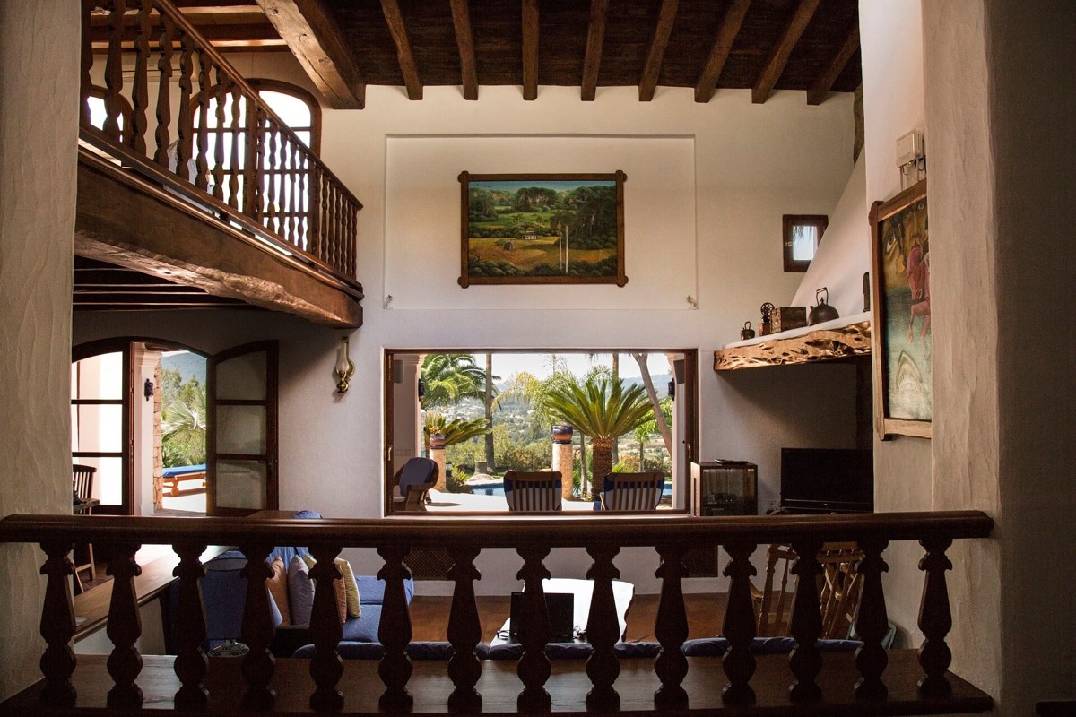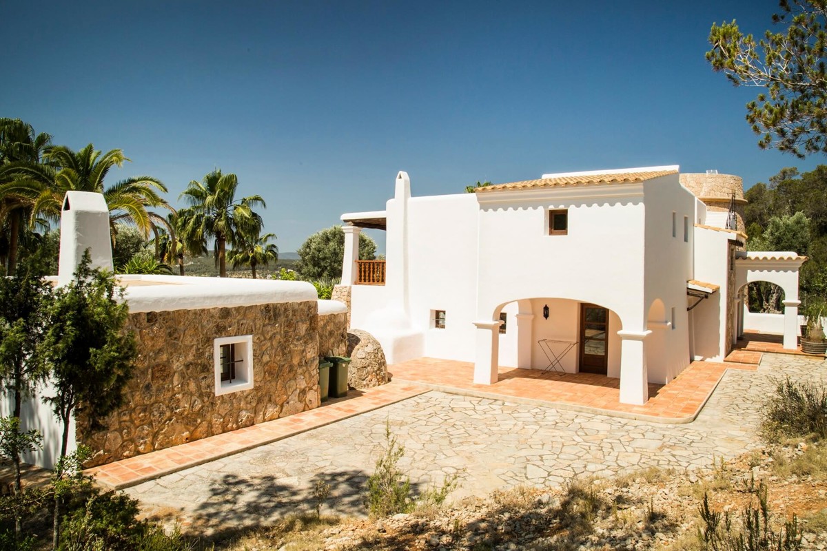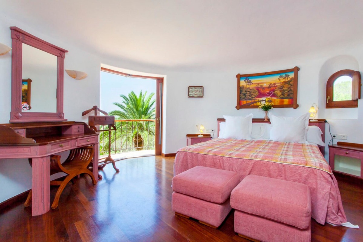 VILLA TORRES CARÓN is a modern villa built in the Ibizan architectural style. Real wood floors in the bedrooms, double-glazed windows (some with fly screens), thick walls, air conditioning and even heating ensure a relaxing vacation even in the cooler months of the year. When you enter Villa Carón, you will find an airy entrance hall with a lounge and fireplace, a seating and TV corner, a large dining area, a guest toilet and a gallery with an additional seating area. From the entrance hall there is a staircase to the left and right to the bedrooms, all of which have a view of the garden and are therefore south-facing. The real wood kitchen is fully equipped and offers additional seating for dining. You have access to the large sun terrace from both the living room and the kitchen. The terrace, which is partly covered, is ideal for a delicious meal in the open air and also for sunbathing on one of the numerous relaxation or pool loungers.
